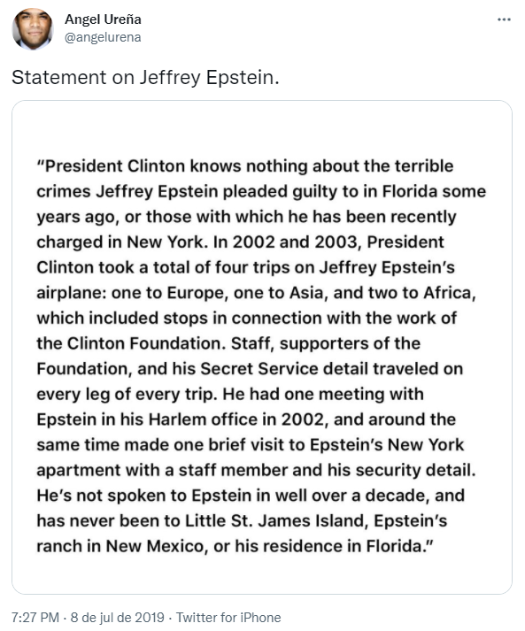 O porta-voz de Clinton, Angel Ureña, disse que o ex-POTUS fez “quatro viagens” no avião de Epstein entre 2002 e 2003. Mais tarde, registros de voo publicados por Gawker em 2015 sugeriram que Bill Clinton pegou pelo menos uma dúzia de voos separados no avião de Jeffrey Epstein.
