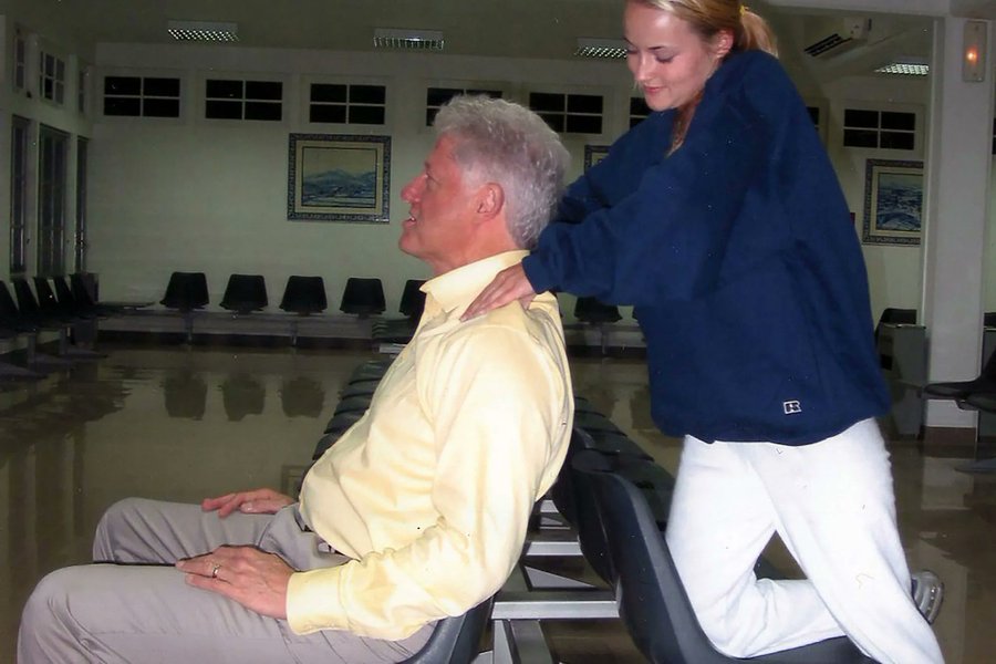 Fotos publicadas anteriormente pelo Daily Mail mostraram Clinton recebendo uma massagem durante sua viagem à África por Chauntae Davies, uma comissária de bordo que afirma ter sido estuprada por Jeffrey Epstein.